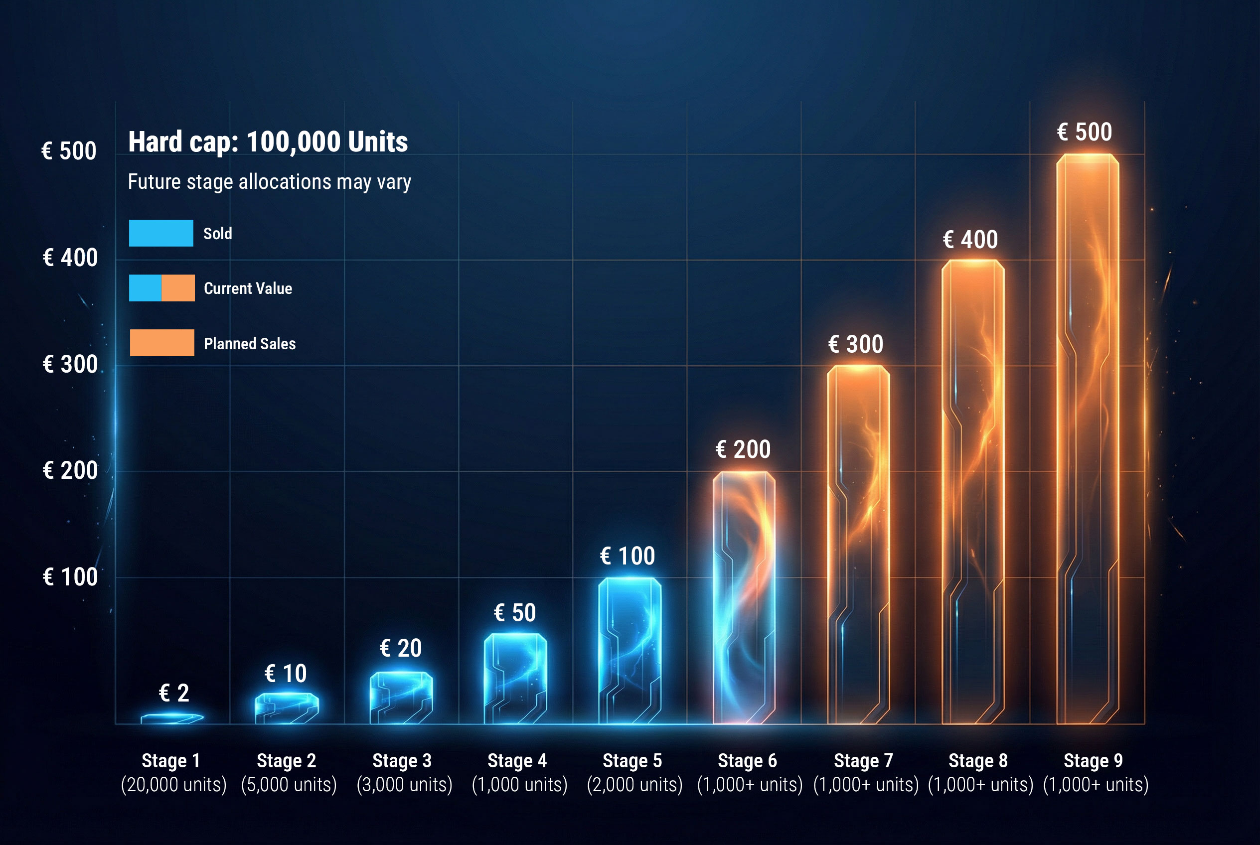 Each phase releases a limited number of units at a predefined price level.