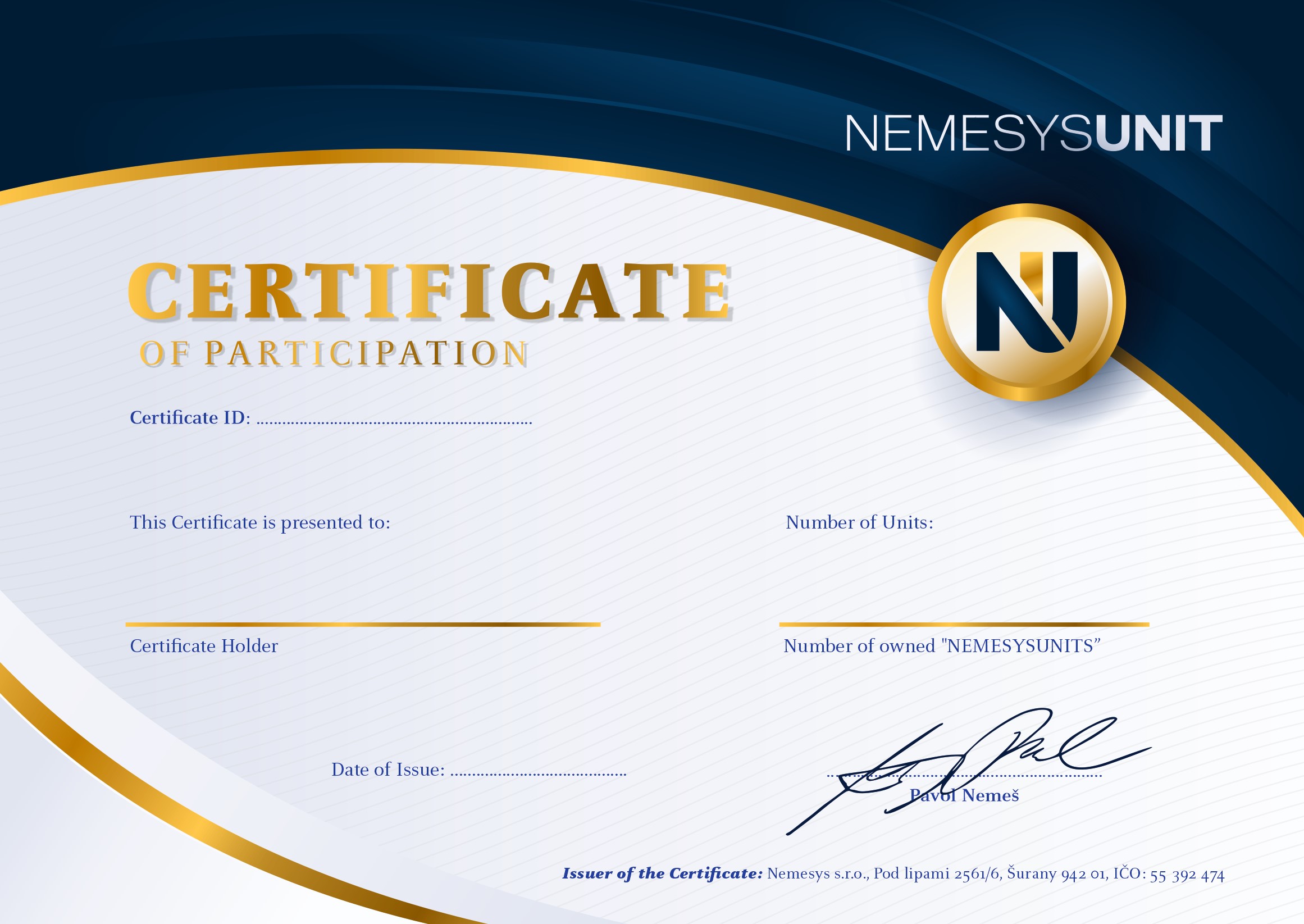 Certifikát NemesysUnit je fyzický, číslovaný certifikát vydaný spoločnosťou Nemesys s.r.o. ako dokumentárny dôkaz účasti na základe Zmluvy o hybridnej pôžičke. Certifikát sa vydáva až po úspešnej úhrade a dokončení procesu uzatvorenia zmluvy.